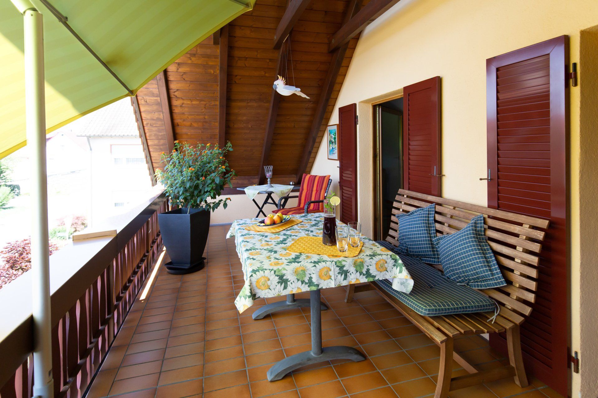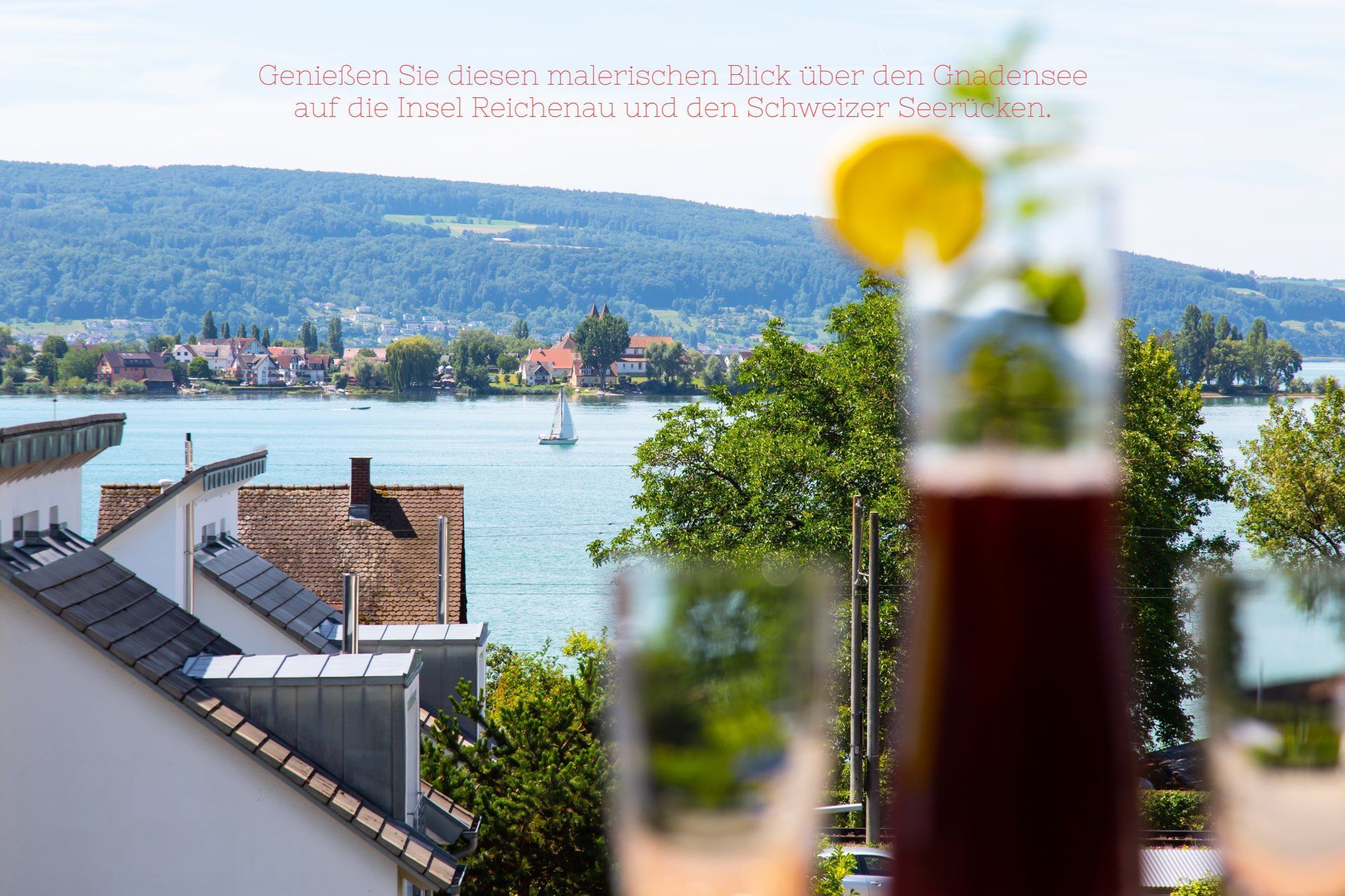 - Vom 18 m² großen, überdachten Südbalkon haben Sie einen offenen Blick auf den Bodensee/Gnadensee sowie die Insel Reichenau und die Schweiz. Ausgestattet ist er mit zwei Sitzmöglichkeiten (großer Tisch mit Holzbank/kleiner Tisch mit Stuhl), zwei Liegestühlen mit Beistelltischchen. Um Ihre Badeutensilien zu trocknen steht ein Wäscheständer bereit.