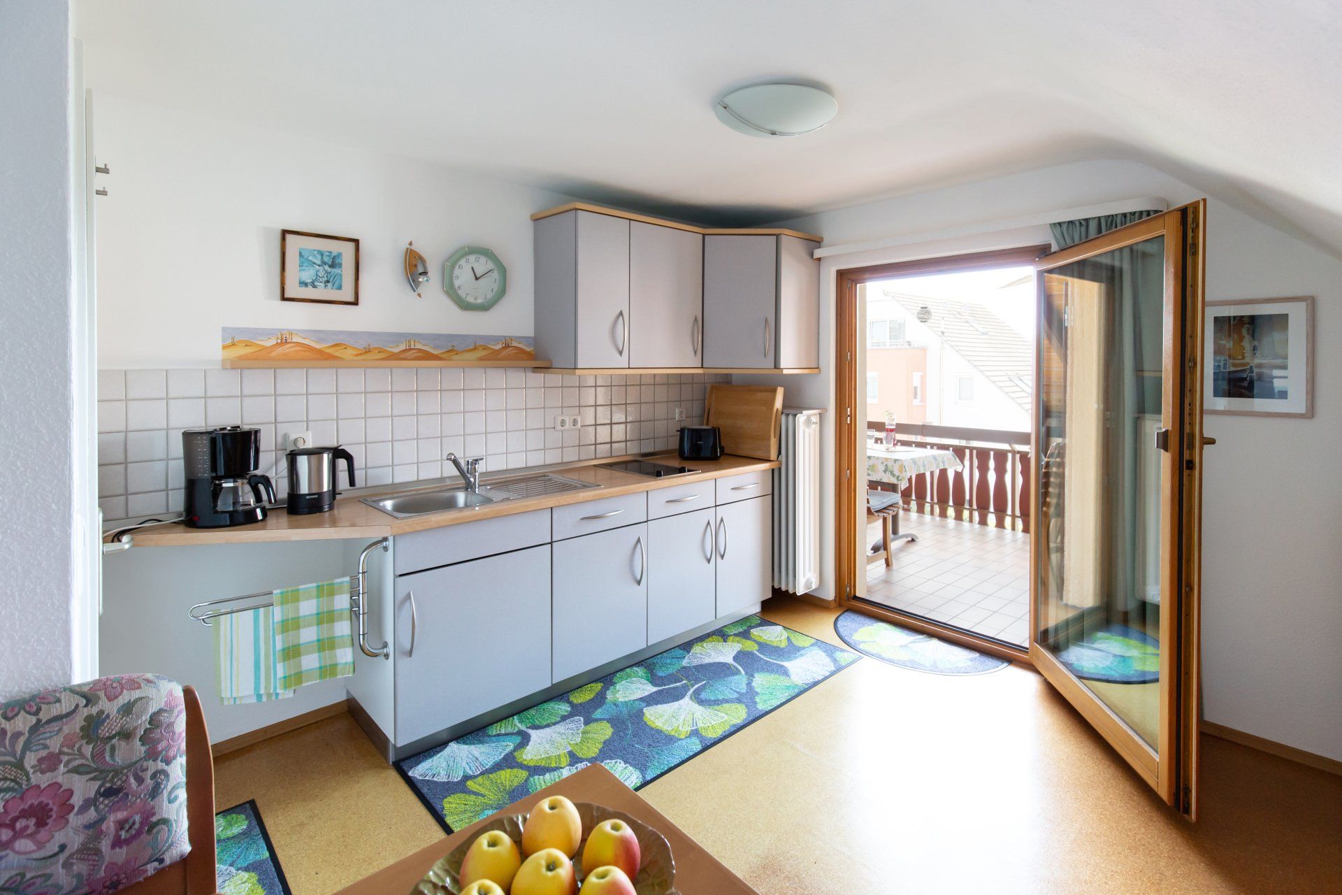 - Auch über die Wohnküche mit gemütlicher Essecke und einer gut ausgestatteten Küchenzeile (Cerankochfeld, Kühlschrank mit ***Eisfach, Mikrowelle mit Grillfunktion, Wasserkocher, Kaffeemaschine, Toaster, Eierkocher etc.) gelangen Sie auf den Balkon.